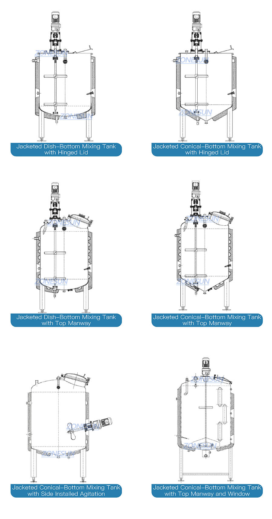 Different types of agitators, such as paddle mixers, propellers, turbines, helical mixers and so on, can be customized as needed.