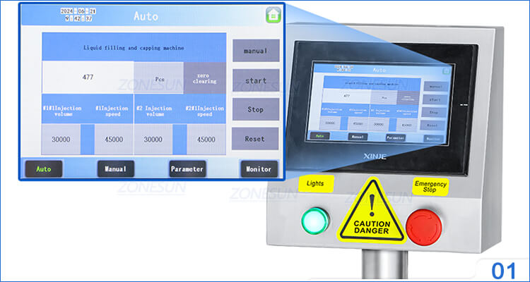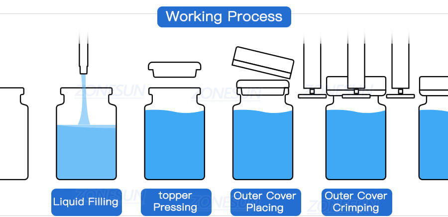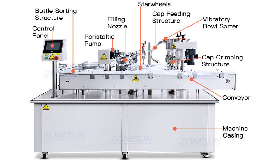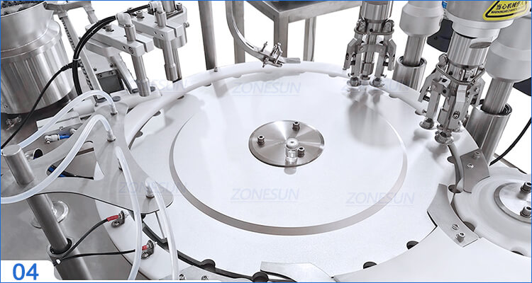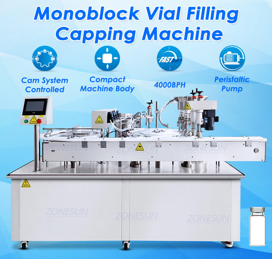 This monoblock machine is designed for packaging vials. It can simultaneously complete liquid filling and vial crimping. Customizable multi-filling heads are available. Peristaltic pump filling ensures packaging quality, making it ideal for small-scale production of care solutions, solvents, etc.
