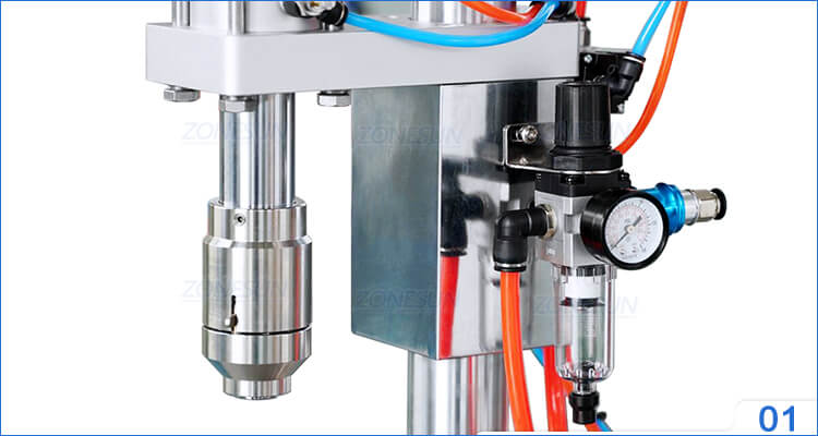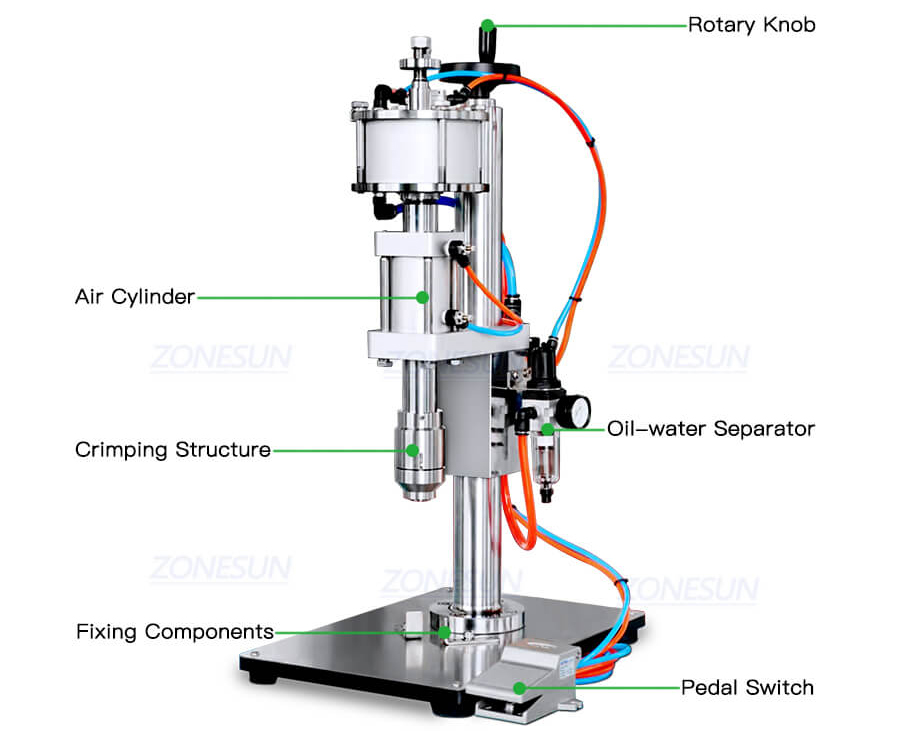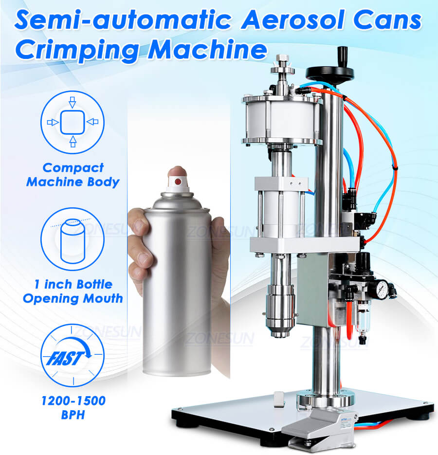This semi-automatic aerosol cans crimping machine consists of a pedal switch to lower crimping head onto the aerosol cans and crimp valves.Compact machine body and suits cosmetics, or household products like sunscreen spray,deodorant.