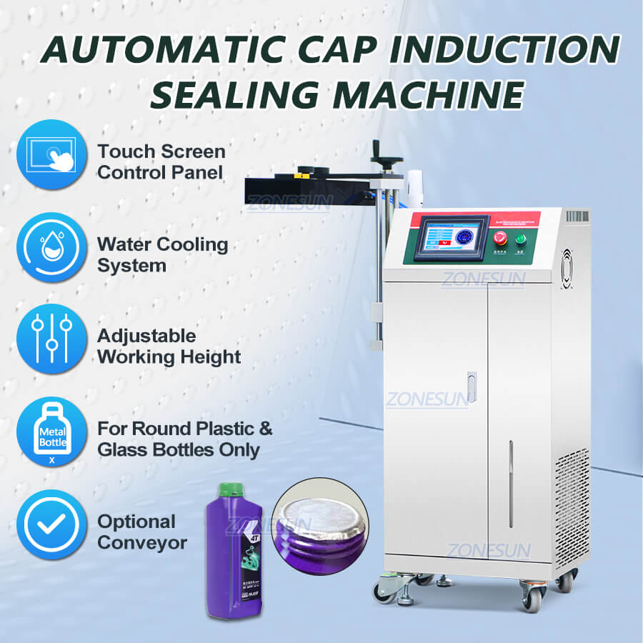 This cap induction sealing machine adopts the principle of electromagnetic induction heating, using non-contact induction heating to instantly melt the adhesive layer of the aluminum foil sealing film. After cooling, the sealing film adheres to the bottle mouth, completing the sealing process. It has fast sealing speed and excellent product sealing performance. It is suitable for sealing plastic, glass, and other non-metallic bottles, it is widely used in the food, beverage, oil, and daily chemical industries. Do not use this machine for flammable and explosive products or in hazardous environments.