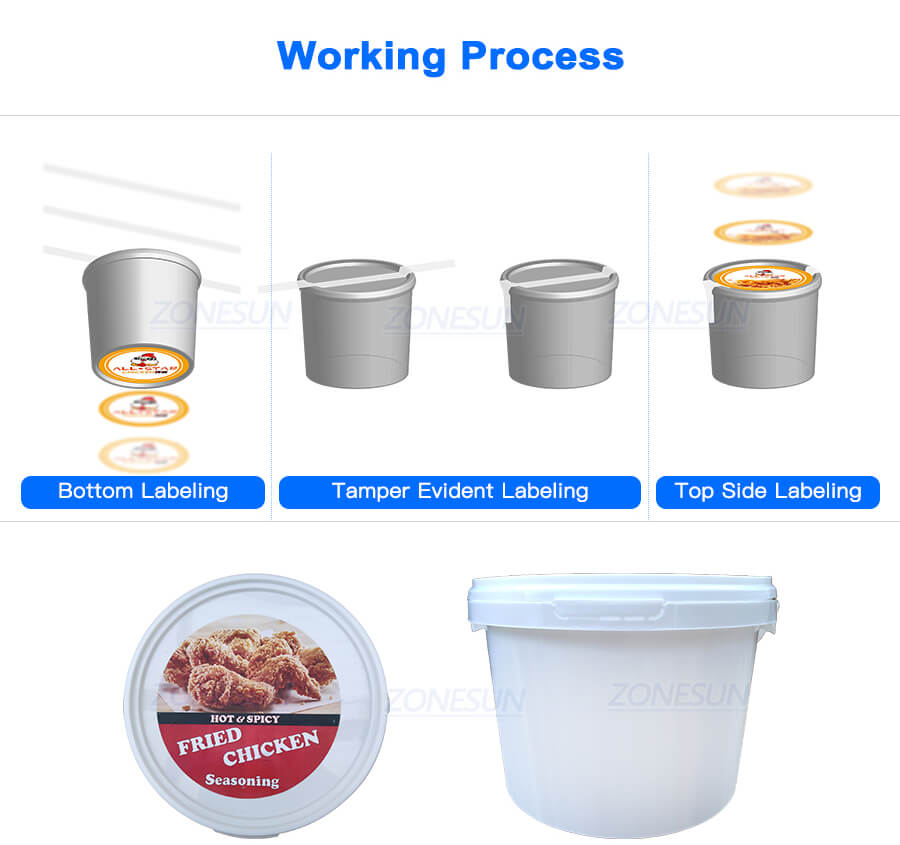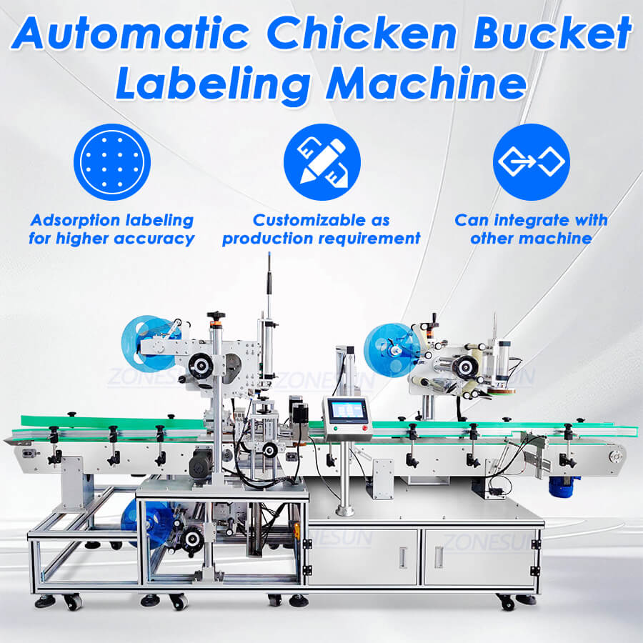 This automated labeling machine simultaneously applies corner tape and labels to both top and bottom surfaces of fried chicken buckets. The integrated hot code printer option prints production dates, expiry dates, and batch codes during labeling, ensuring FDA-compliant food packaging.