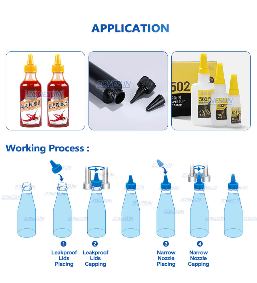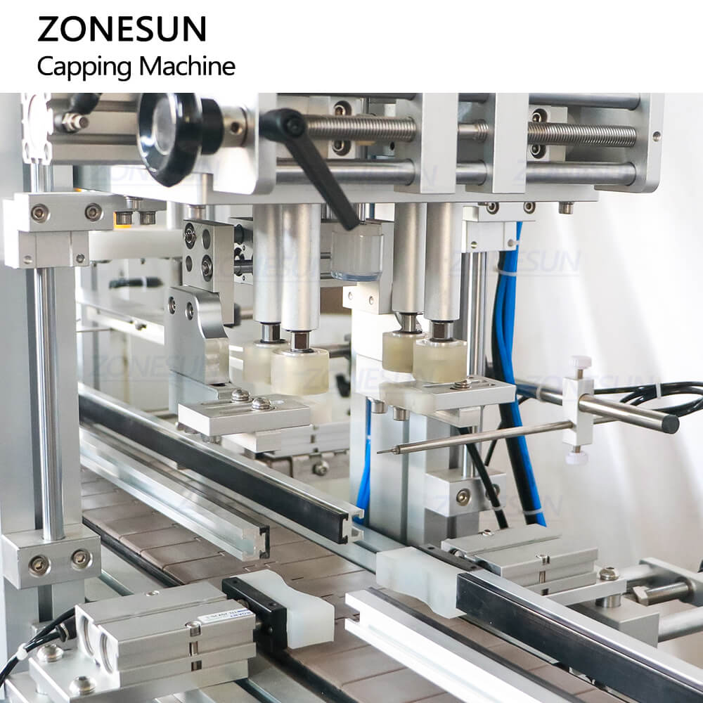 This capping machine is customized for nozzle bottles, and can finish cap feeding, cap tightening. This capper machine can integrate with filling, and labeling machine to realize automated production.