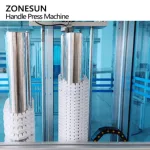 The machine is equipped with two clamping structures that can efficiently pick up handles and load them onto bottles, thus helping to reduce labor costs.