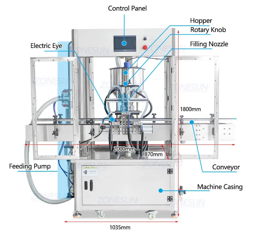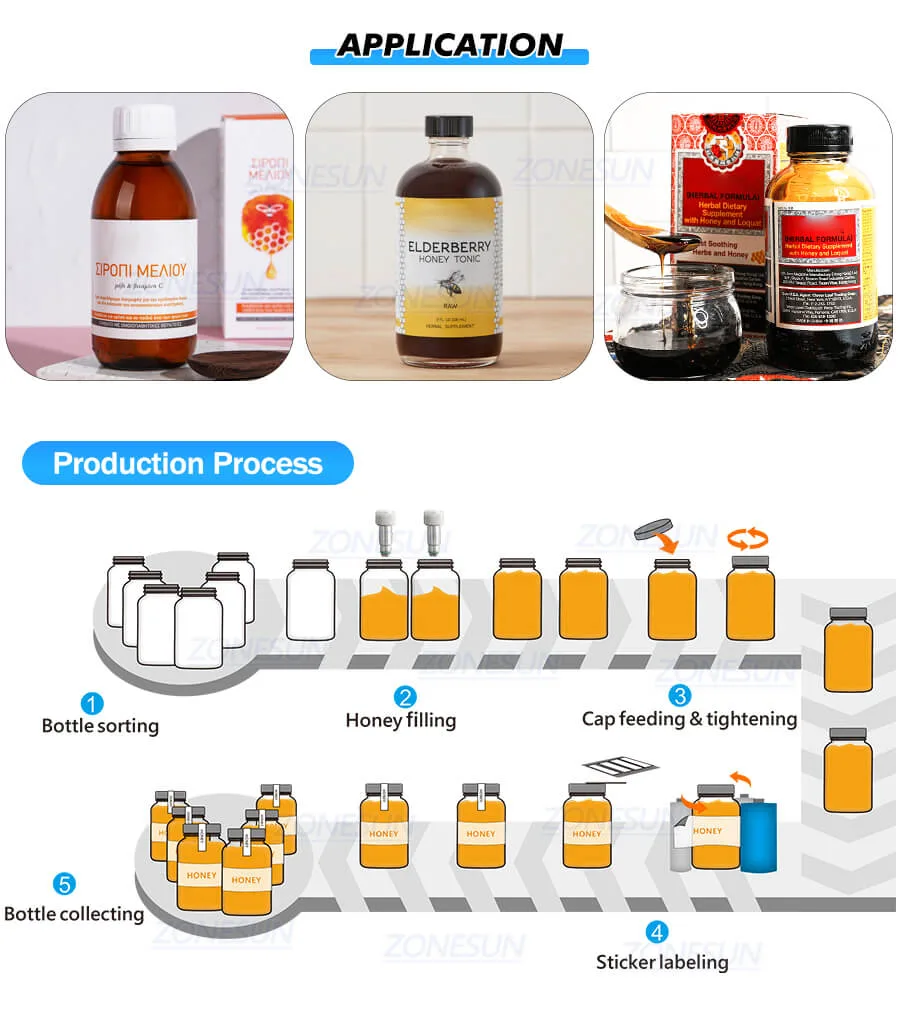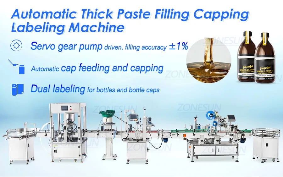 This paste filling line incorporates bottle unscrambling, filling, capping, labeling and sorting machines. Filling is controlled by servo gear pump, which can be used for packing viscous liquid or paste like honey, lotion, hand gel, etc. The machines can be customized according to your production need.