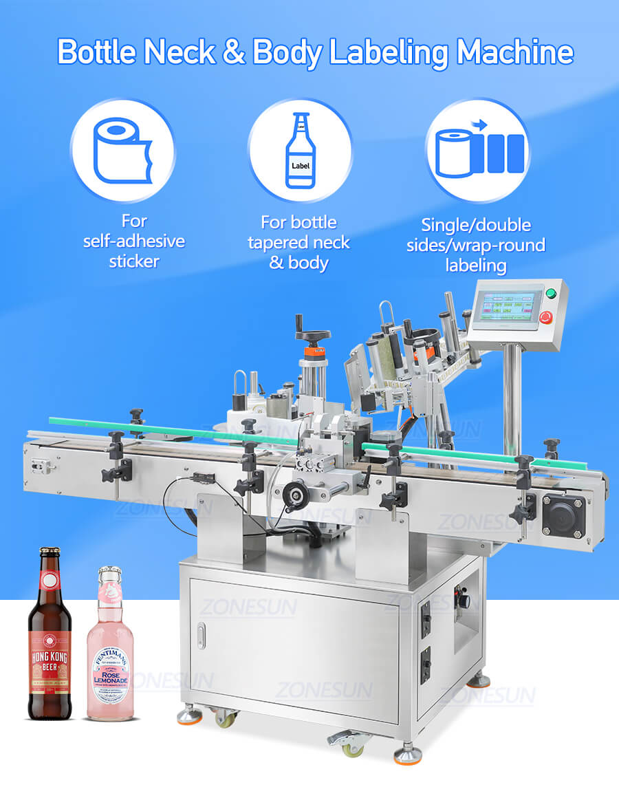 Designed for sticking labels on bottle neck and boy at the same time, it is good for single side/double sides/wrap-around labeling.