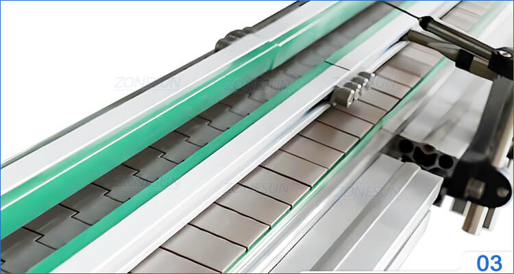 The length and width of conveyor can be customized. It can be connected with filling and capping machines.