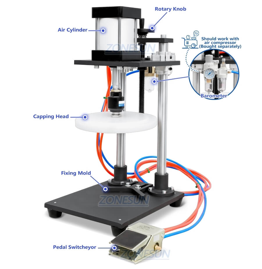 Featuring a high-performance pneumatic cylinder, this machine delivers exceptional durability and stable operation. Powered entirely by compressed air (no electrical components required), it includes a foot-pedal switch for effortless control. Ideal for sealing various containers, including plastic buckets, cans, bottles, and food-grade barrels.