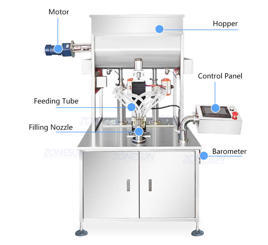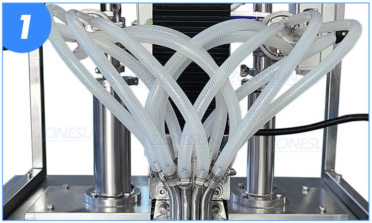 This advanced filling machine is designed with multiple filling nozzles to simultaneously dispense two different colored substances. With its unique feature, you can achieve a mesmerizing dual-color spiral effect while filling. The machine conveniently holds the bottles on a sturdy base, and the filling nozzles descend to perform the filling process. The base is also rotatable, adding versatility to your filling operations.