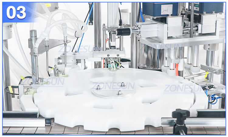 Filling, capping placing and capping work are controlled by cam system, it can reach 25-30BPM.