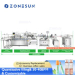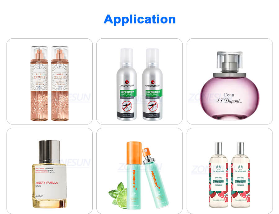 This filling line is consist of monoblock spray filling capping machine, round bottle labeling machine, bottomless conveyor, bottle turntable machine and optional inkjet coding machine.It is suitable for small scale production of body mist, perfume etc.