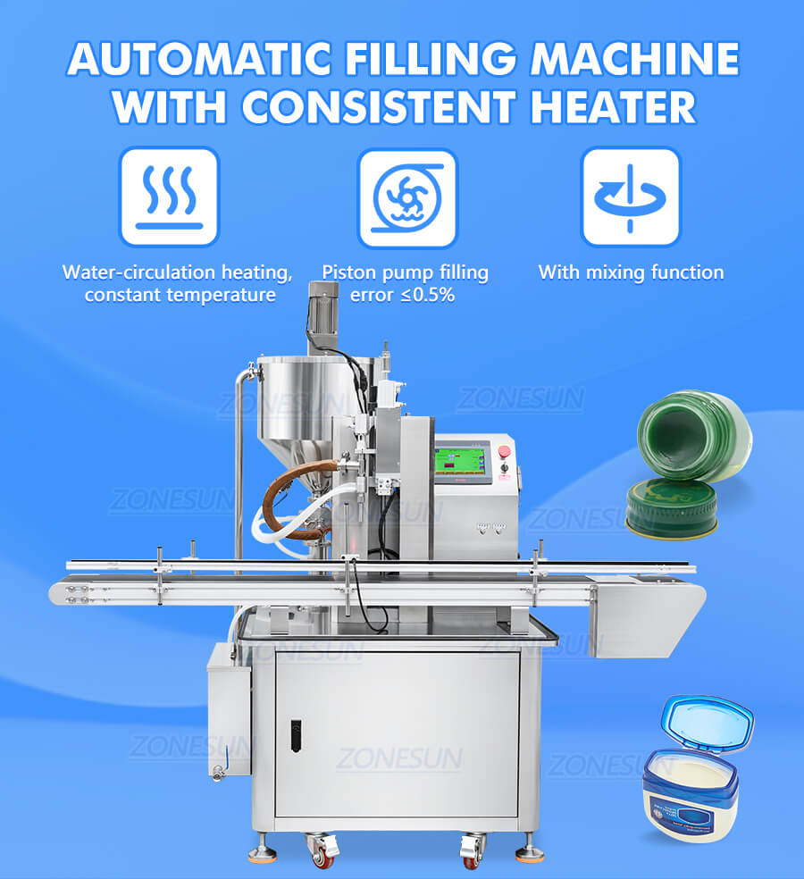 This paste filling machine uses a piston pump, which is suitable for filling pastes such as vaseline, skin cream, sauce, honey, etc. The storage barrel adopts a double-layer structure design, using a water circulation heating system and a stirring system to prevent the material from solidifying and ensure the smoothness of the filling process.