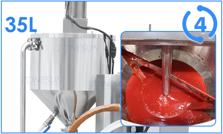 The hopper is equipped with mixer, which is good for handling viscous products. The mixing speed can be adjusted.