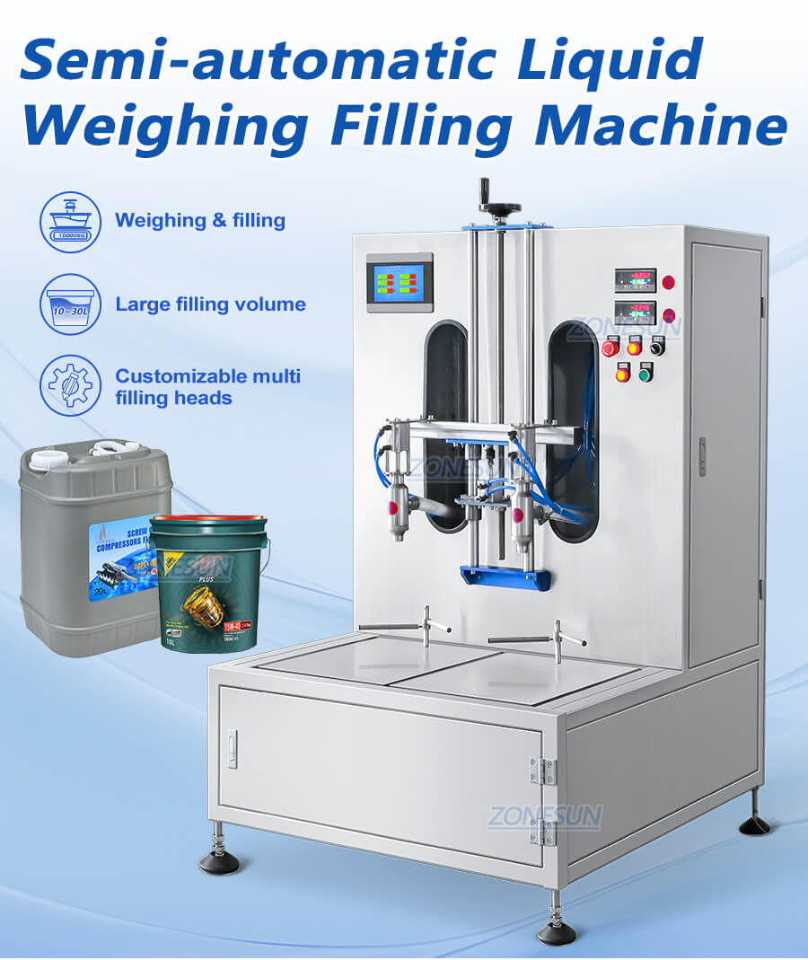 Equipped with weighing scale,suitable for large filling volume(10-30L),easier to debug machine.
