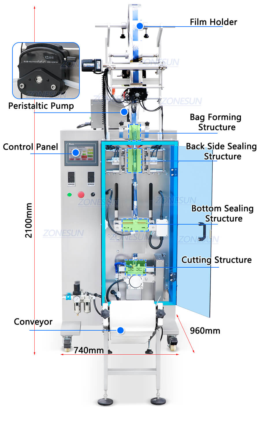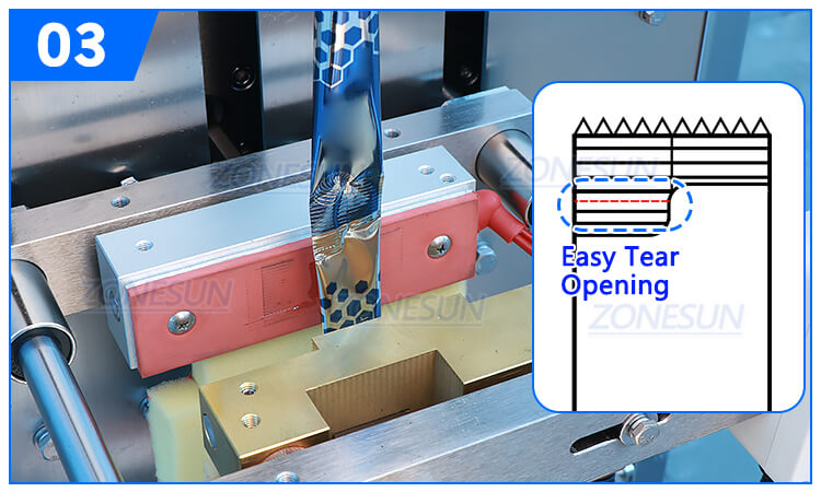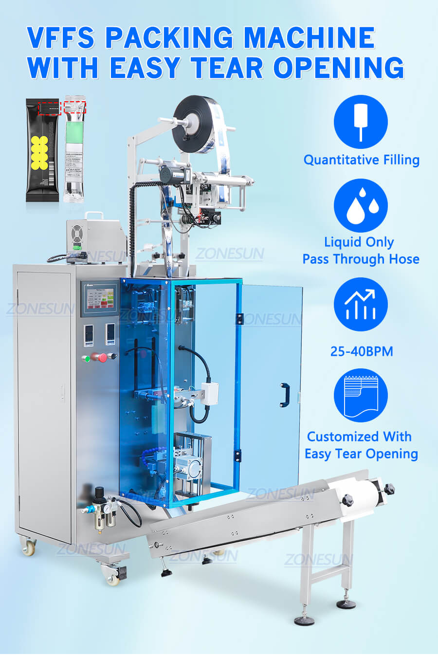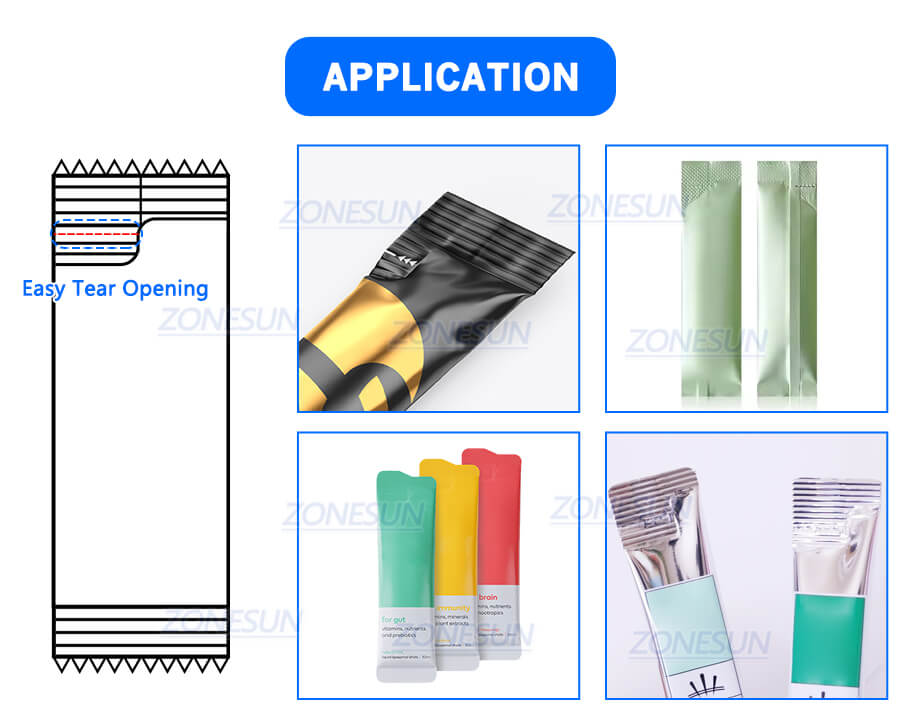 This packaging machine is designed for packing liquid into stick sachet and create the easy tear opening.It is equipped with peristaltic pump, liquid only pass through hose during filling work, it is good for packaging energy drinks, mineral supplement drinks etc.