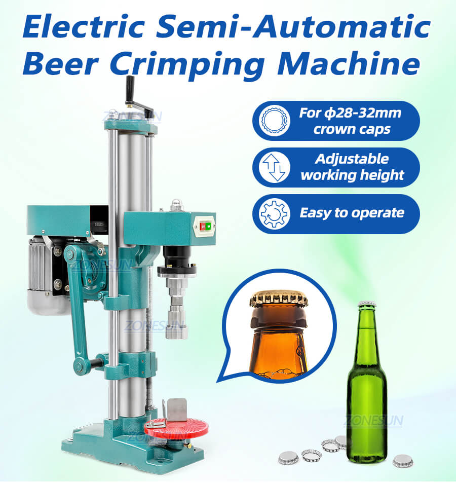 This beer bottle capper is designed for crimping crown caps with a diameter of 28-32mm. It operates solely on electricity, eliminating the need for an air compressor. We can also customize it for ring-pull caps.