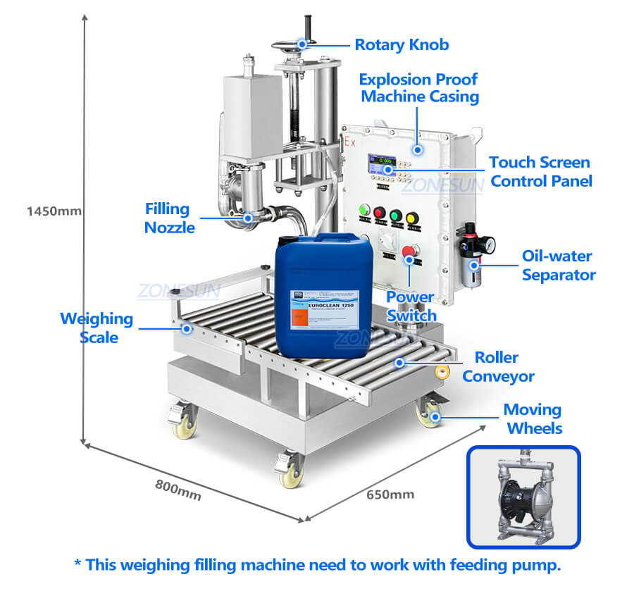 This filling weighing machine is designed for large volumes of flammable liquid products like thinners and white spirit. It features a compact design.