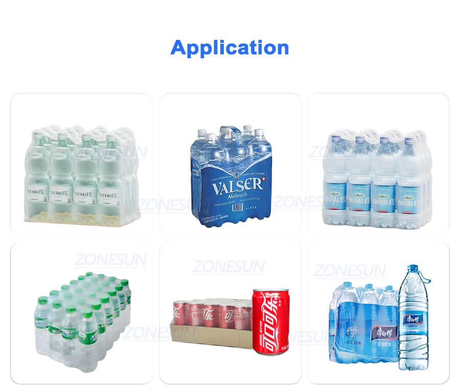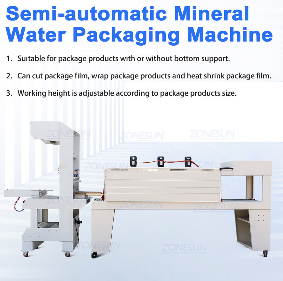 This packaging system consists of a semi-automatic film wrapping machine and a heat shrinking tunnel. It’s ideal for cans, mineral water, beer, glass bottles, beverages, and other containers with or without a bottom support, ensuring a perfect packaging effect.