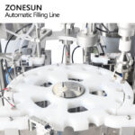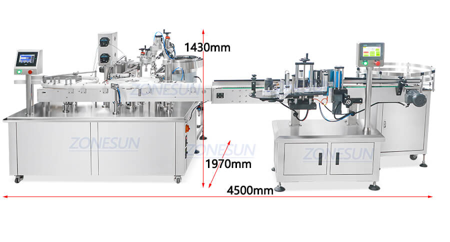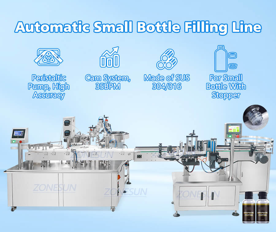 This filling system is consist of monoblock filling capping machine and labeling machine, it suits packaging small bottle with stoppers like essential oil, cleaning oil etc.This filling system can reach 35BPM, this is suitable for small or medium scale production.