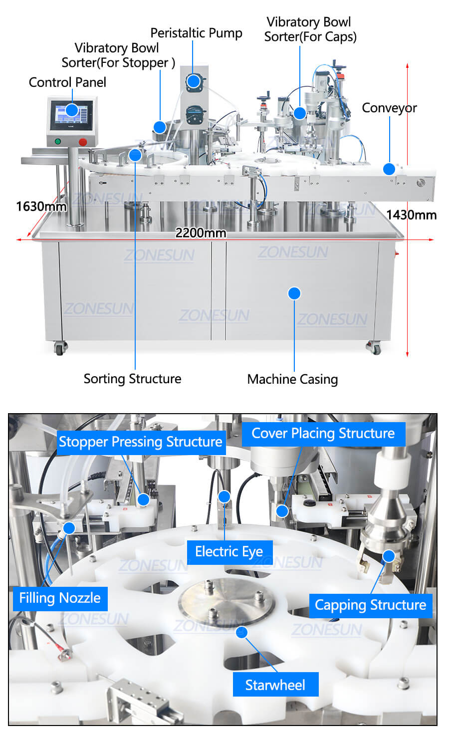 | Machine size | About 2200*1630*1430mm(Main Machine) About 605*455*1040mm(Vibratory Bowl Sorter For Stopper) About 605*455*1070mm(Vibratory Bowl Sorter For Caps) |