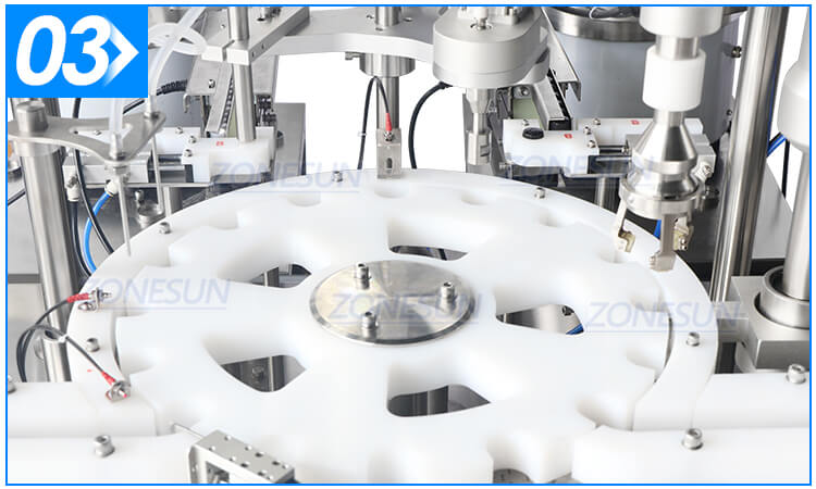 Use cam system to control filling & capping work, each working station can work at the same time to improve efficiency(35-40BPM)