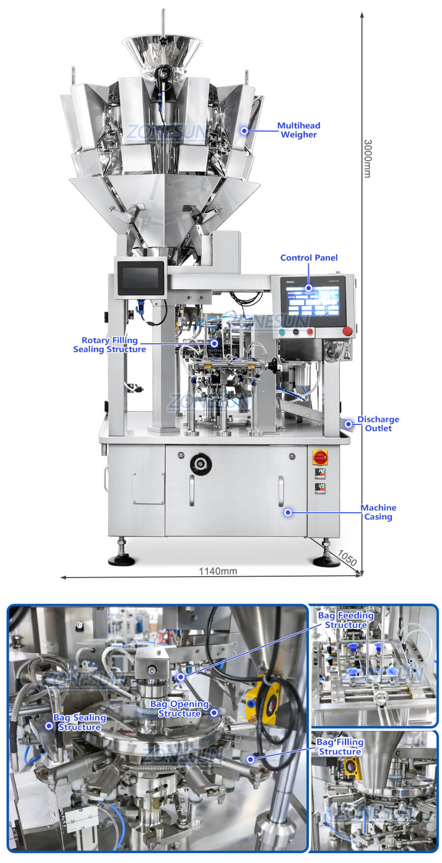 This rotary type packaging machine efficiently fills granular products into premade sachets, featuring enhanced production capacity for seasonings, pet food, tea, and more. Customizable to accommodate various pouch types including zipper-lock bags for versatile packaging solutions.