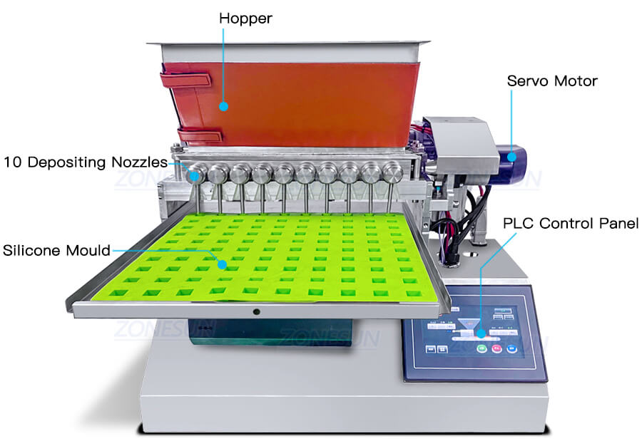 The ten depositing nozzles can also keep heated during production, ensuring smooth production. The quantity of depositing nozzles can be customized as your need.