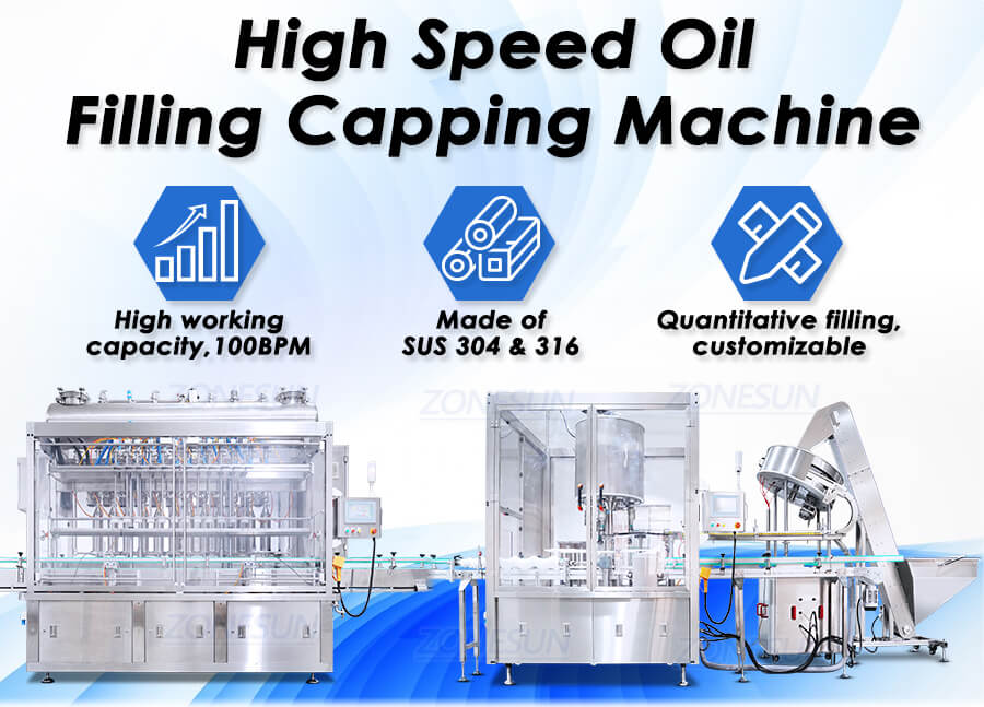 This filling system consist of 16 heads filling machine and 12 heads capping machine, working capacity can reach 100BPM, it suits medium and large scale production of cooking oil, motor oil.