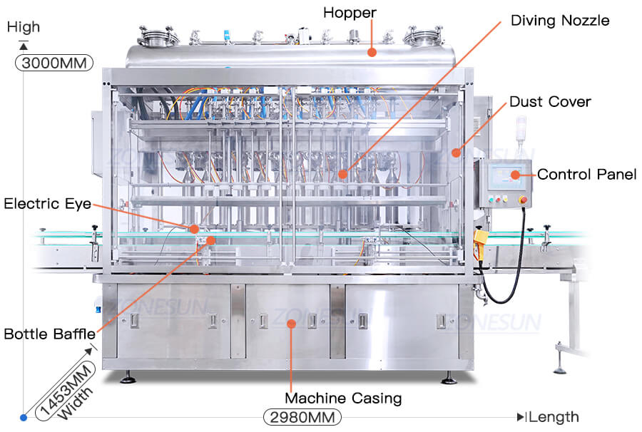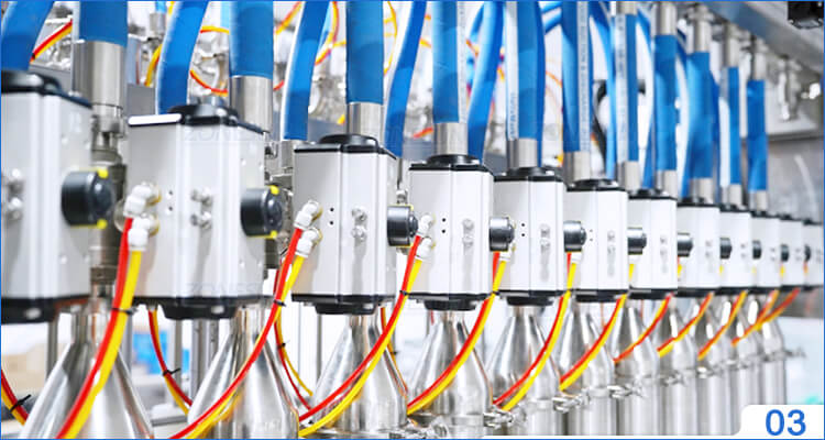 One motor drives all piston rods to rise and fall simultaneously, it can slightly adjust the filling volume of each filling nozzle.