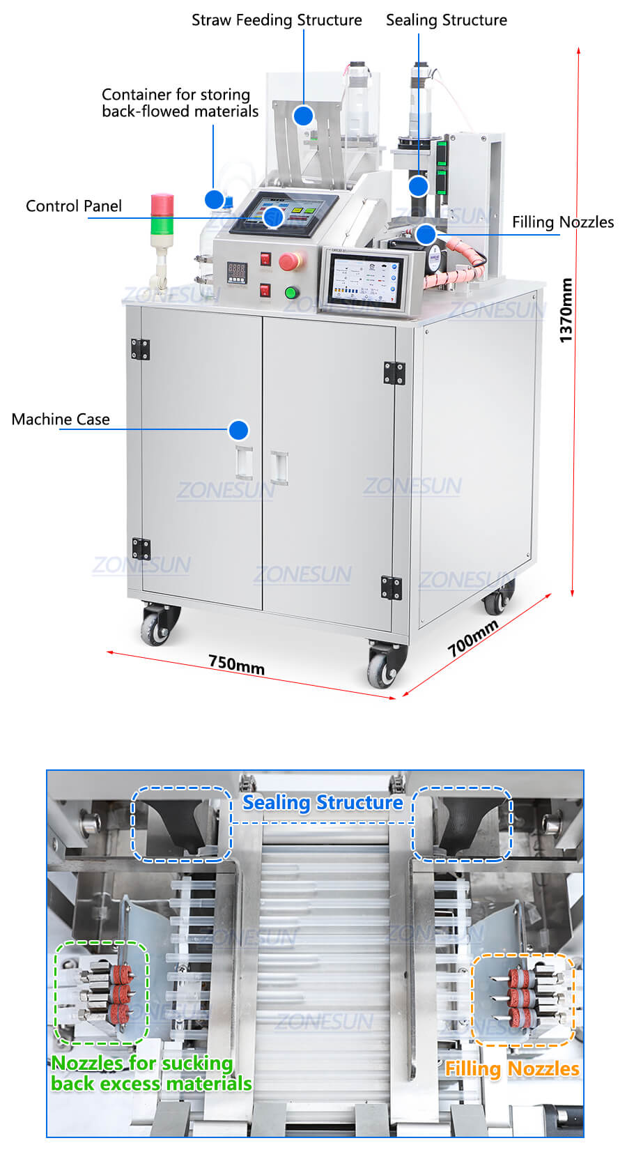 It is designed for sucking back excess materials, ensuring filling accuracy.