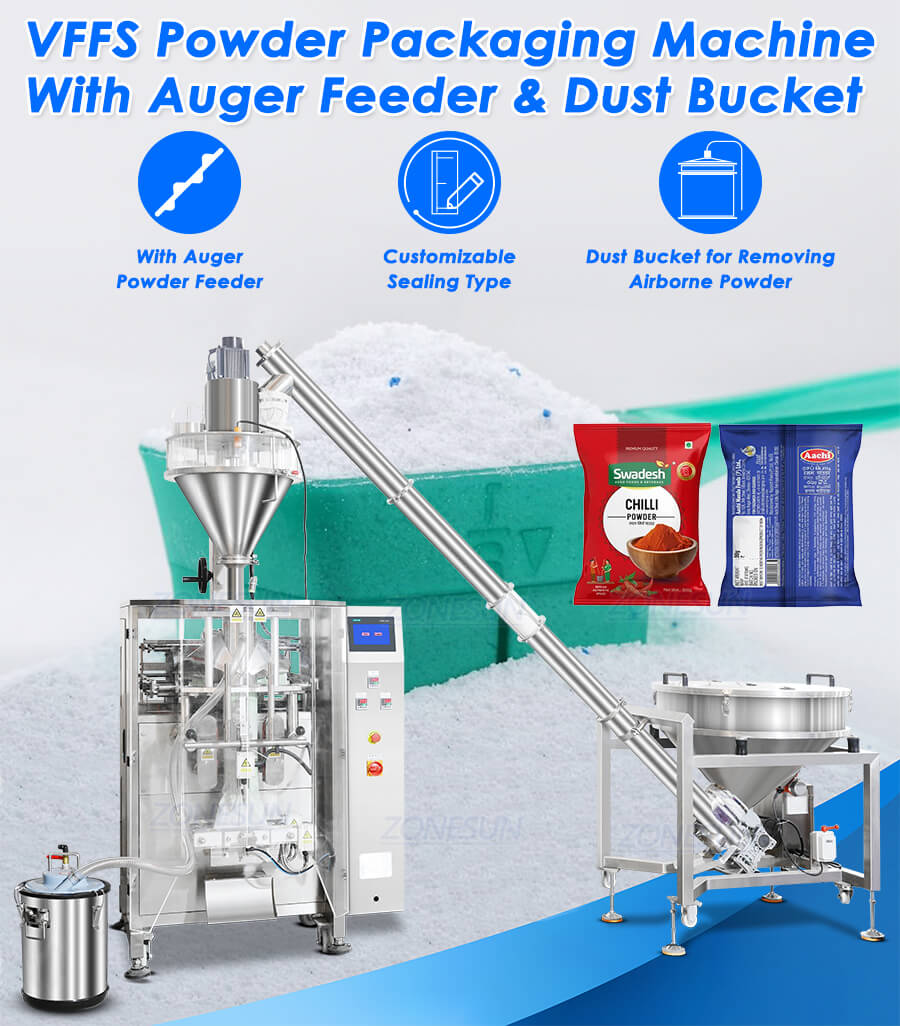 This automatic powder packaging machine is equipped with an auger feeder and dust collector, designed for precise powder feeding, high-speed sachet filling, and automated sealing. Ideal for large-scale production of detergent powders (shampoo powder, laundry detergent, bleaching powder) and industrial chemical powders.