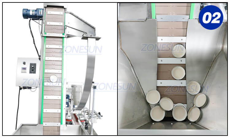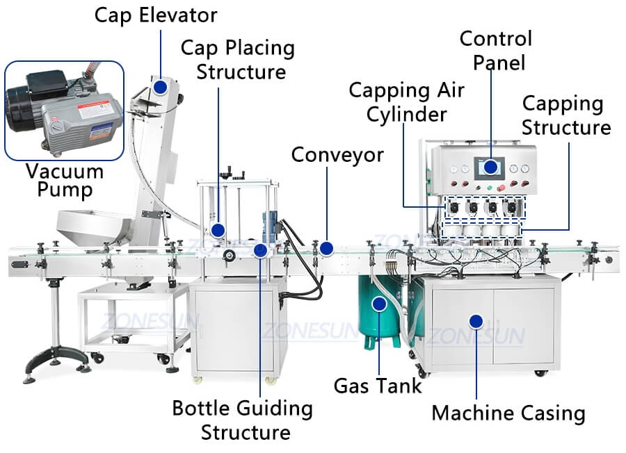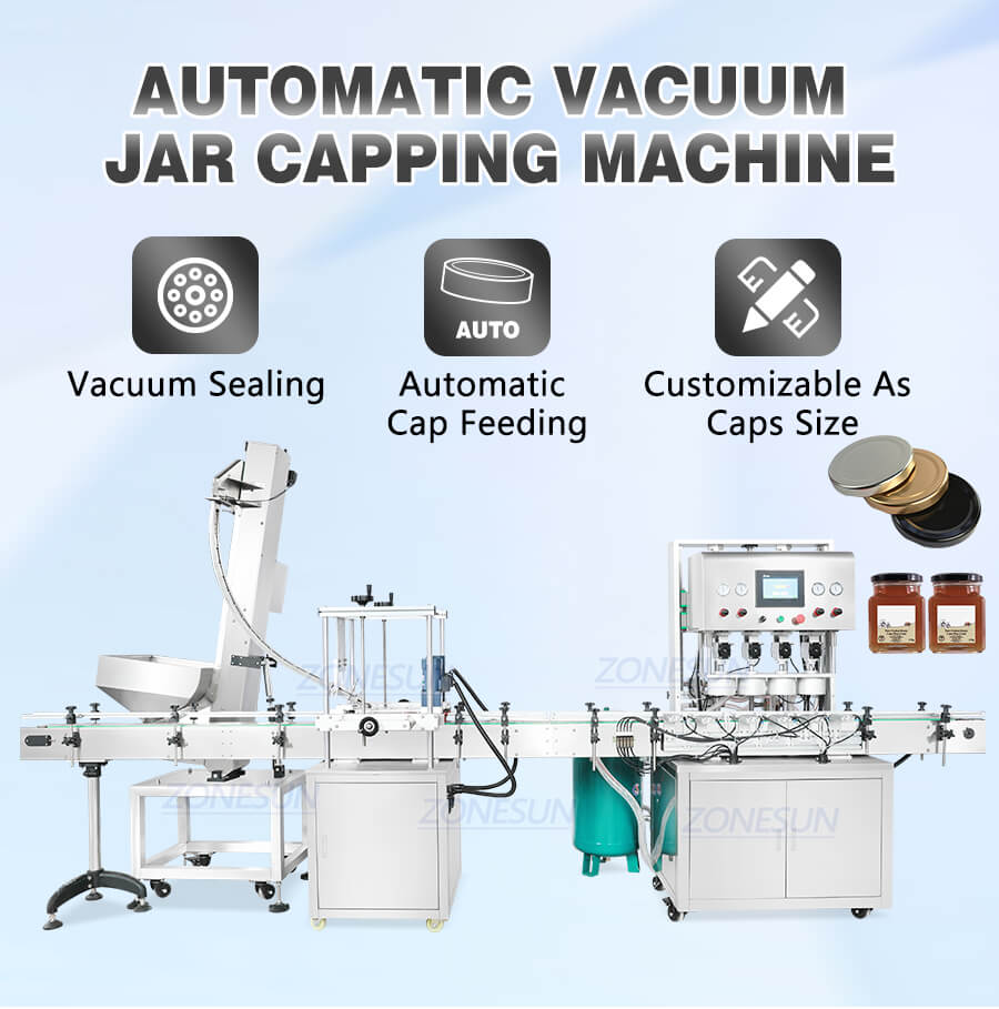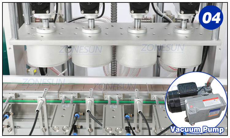This vacuum capping machine uses a vacuum pump to achieve vacuum sealing of jars, is equipped with a cap feeder for automatic cap supply, and the number and size of capping heads can be customized according to production needs.