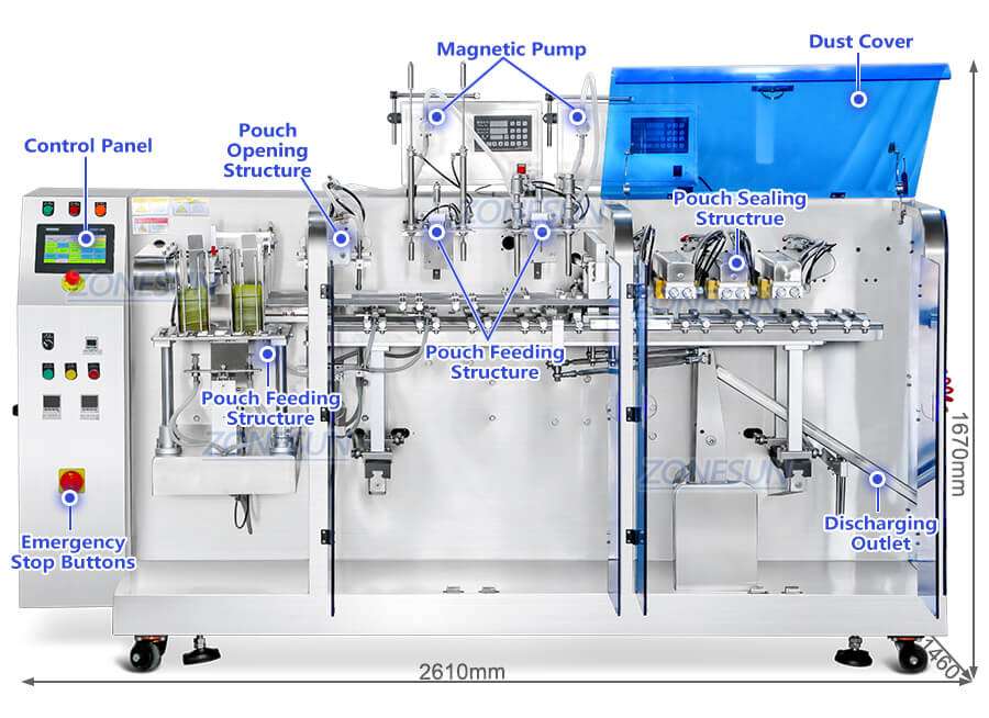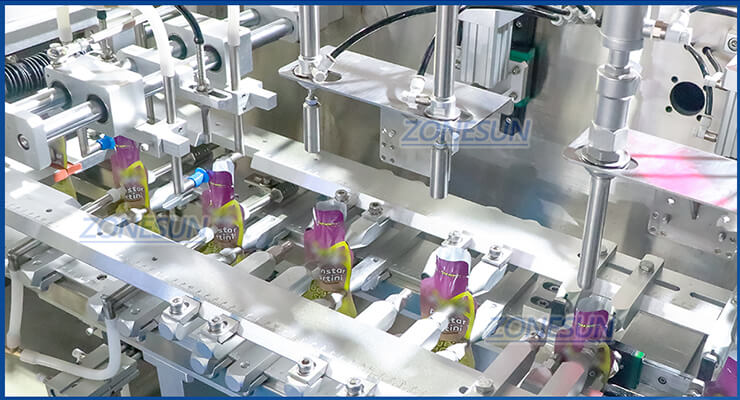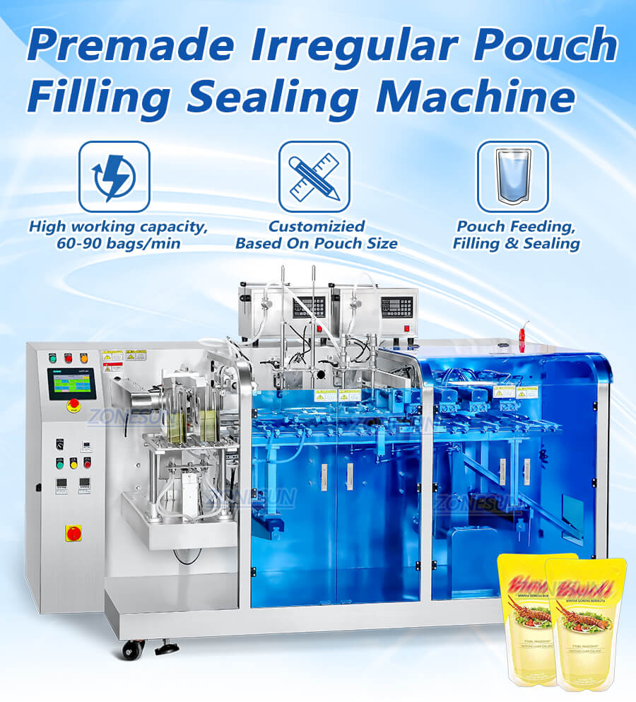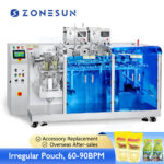 This packaging machine is designed for irregular premade pouches. It can handle pouch feeding, opening, liquid filling, sealing, and product discharge. It’s ideal for packaging energy drinks, cosmetics samples, and personal care products.