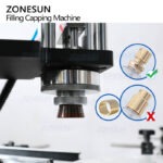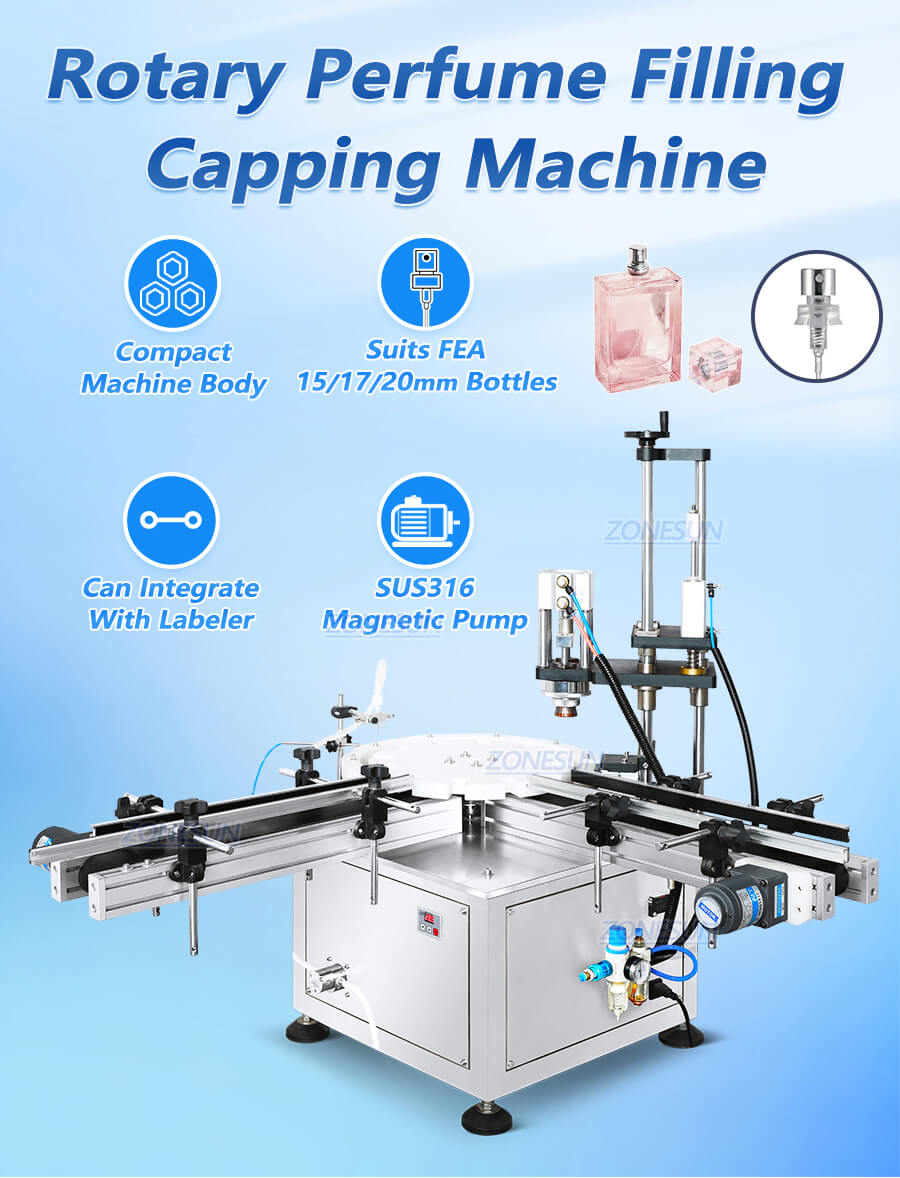 Compact machine body saves working space, it can fill liquid into bottles and crimp perfume spray caps.Changable crimping heads makes this machine suits different sizes of bottles. It is suitable for small scale production.