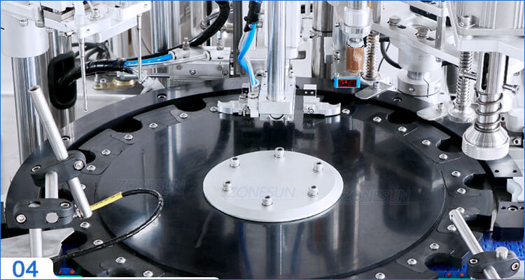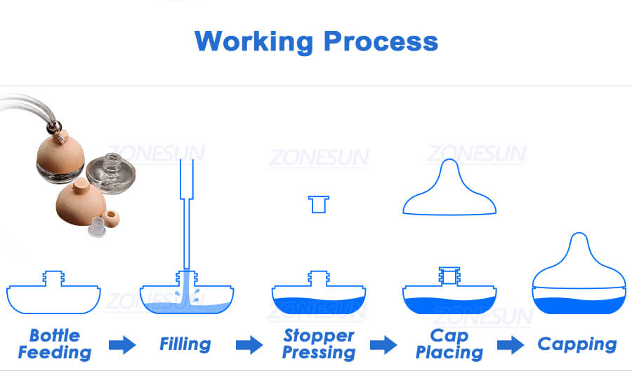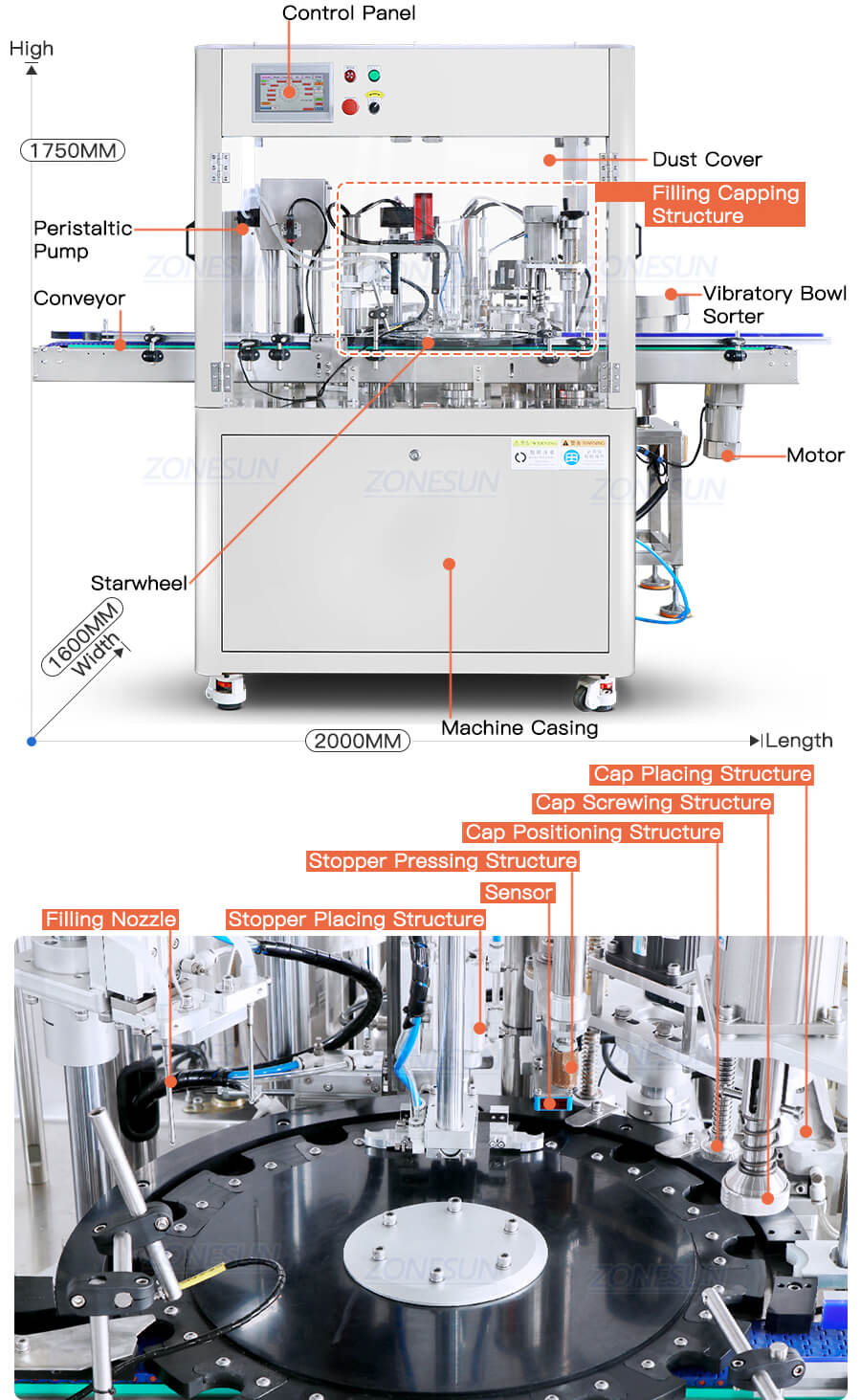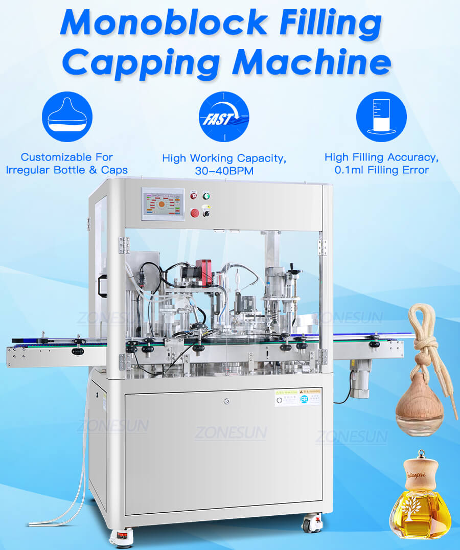 The monoblock machine controls filling and capping work by cam system, each working station can work at the same time. It has higher working capacity, it can reach 30-40BPM, suits liquid products in small containers like car perfume, massage oil, machines can be customized for irregular bottles and caps.