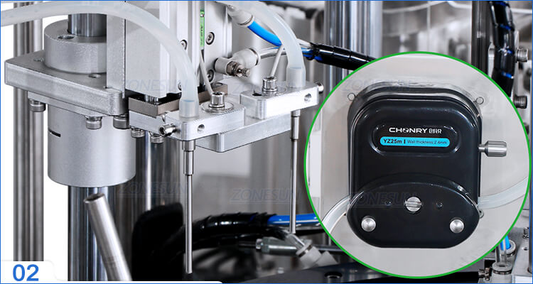 Quantity of filling nozzles is customizable, peristaltic pump ensures liquid only pass through hose, production is cleaner.