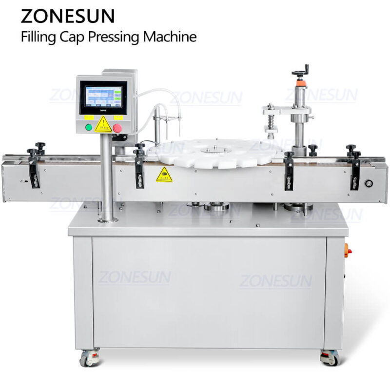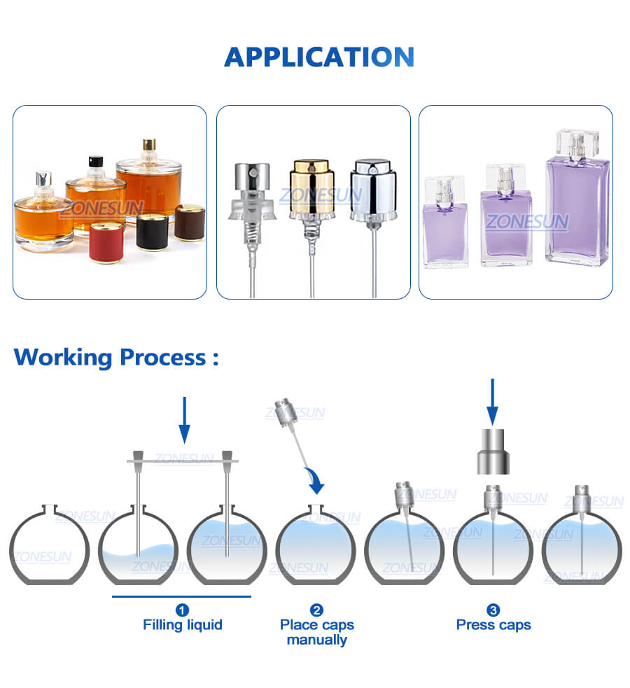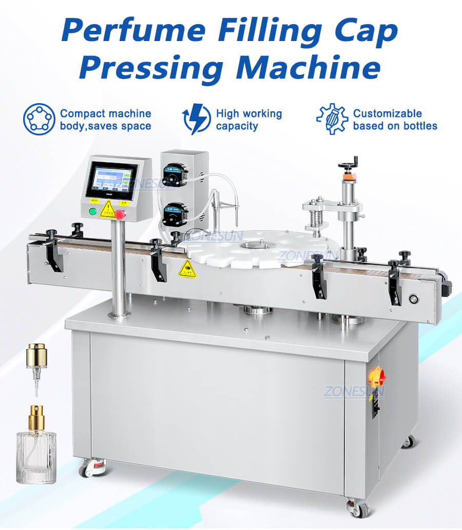This monoblock machine is suitable for packaging perfume includes liquid filling, cap pressing. Packaging work is controlled by cam system which ensures each working station can work at the same time to improve working capacity greatly.