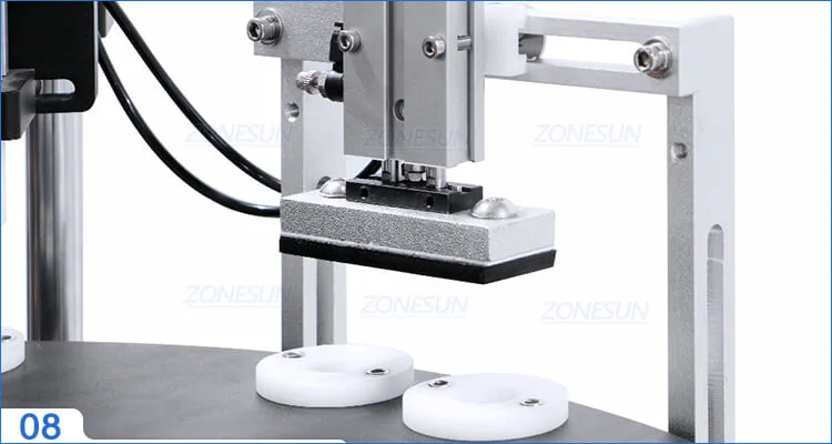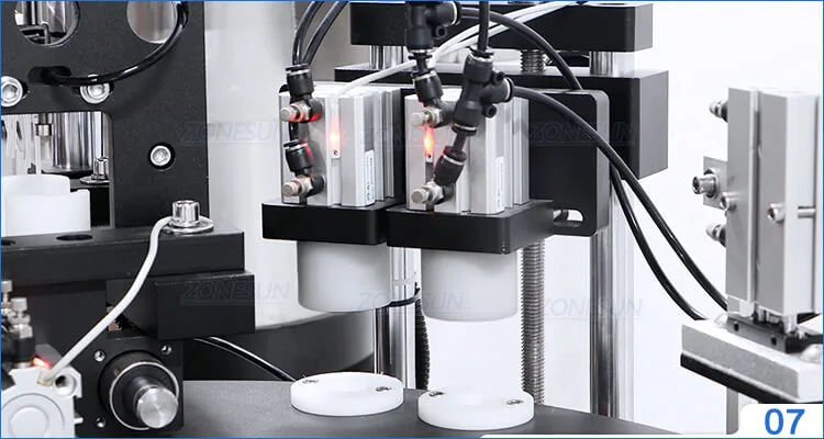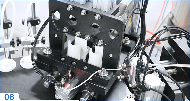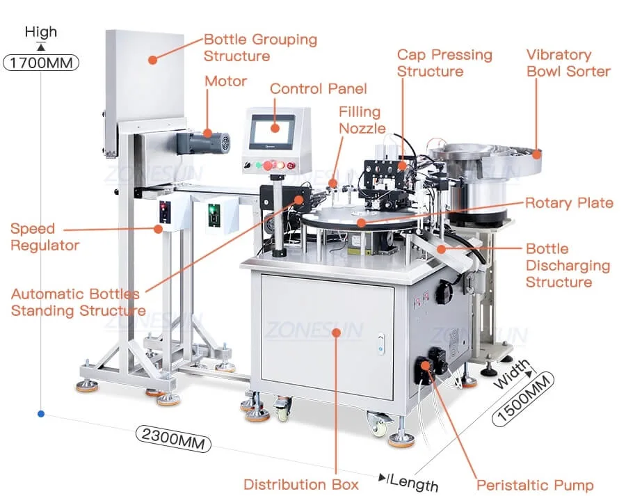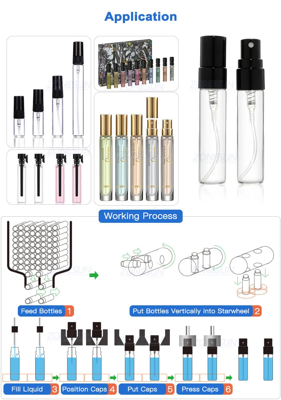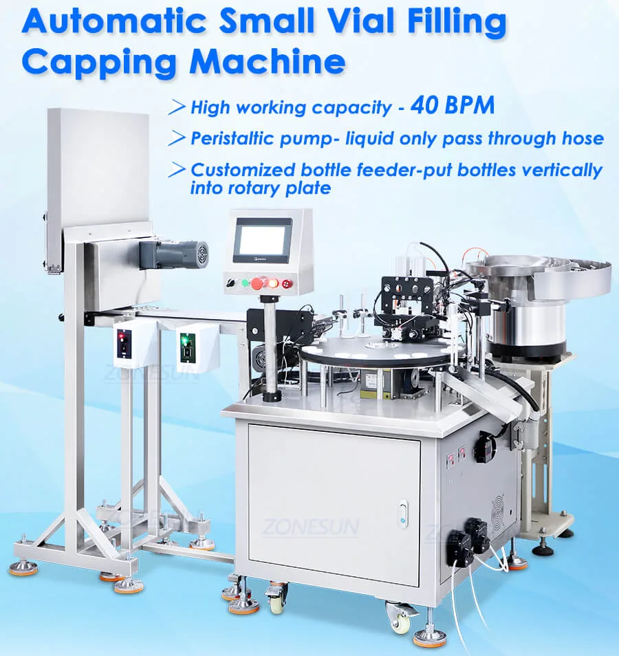 This filling capping machine is equipped with a peristaltic pump, ideal for small volume liquid filling with high accuracy. It also features a bottle unscrambling structure, allowing for vertical bottle placement and automated production. This machine is suitable for perfume vials.