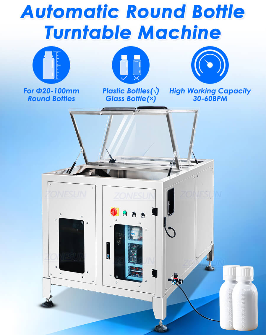 This turntable machine can integrate with filling machine, capping machine or labeling machine to realize automated bottle feeding and improve working efficiency.It has high working capacity and can reach 30-60BPM.