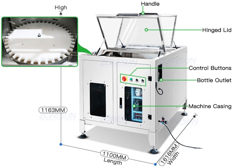 It is adjustable according to bottle size, this can be customizable for integrating with filling capping or labeling machine.