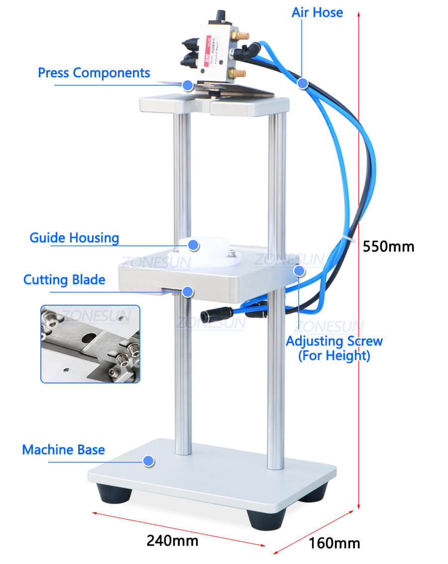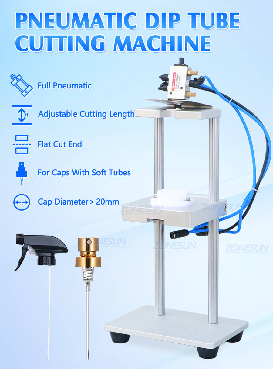 This dip tube cutting machine is mainly used for cutting hose of bottle. It has small machine body and really easy to operate. The working height of this machine can be adjusted according to operation need.