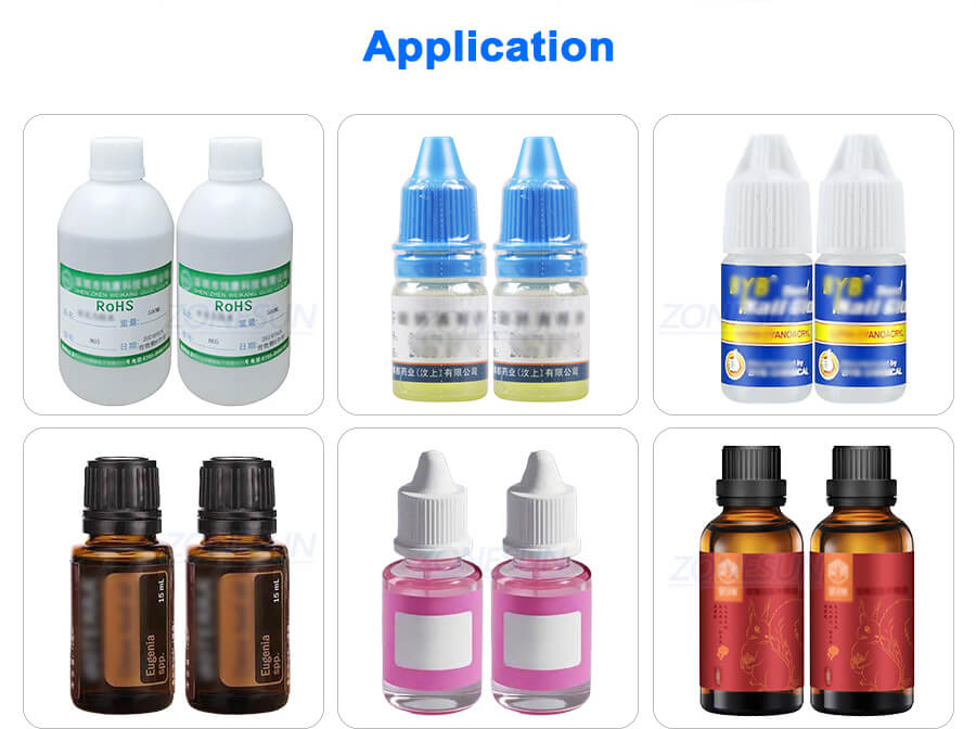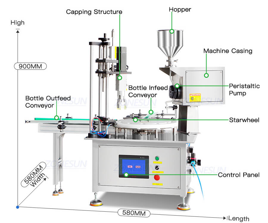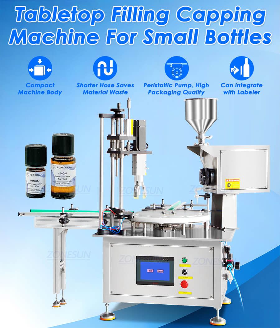 Tabletop machine design suits small scale production of nail polish, massage oil, cosmetic serum or eyedrops.It equips peristaltic pump, liquid only pass through filling hose.Starwheel is customizable as production need.