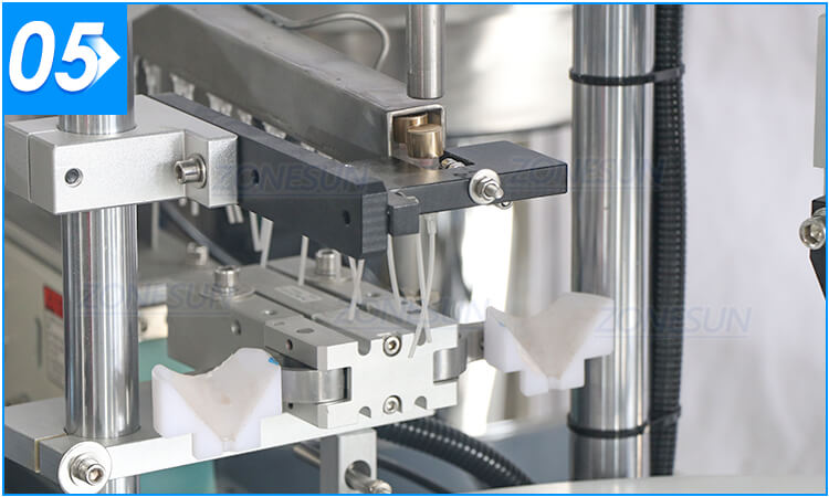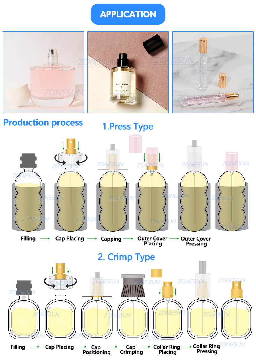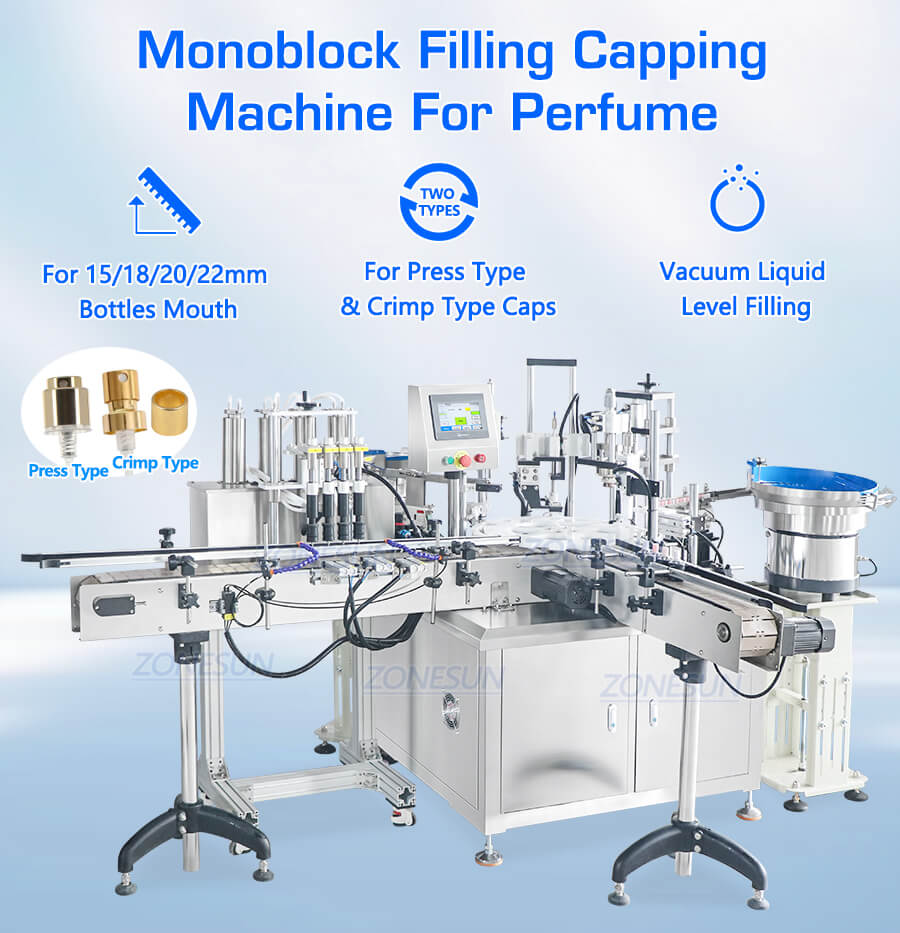 This monoblock filling machine has compact machine body and can realize filling, cap feeding, capping at the same time. It is suitable for small scale production of perfume with 15/18/20/22mm bottle opening mouth.