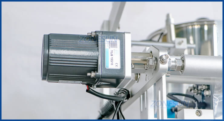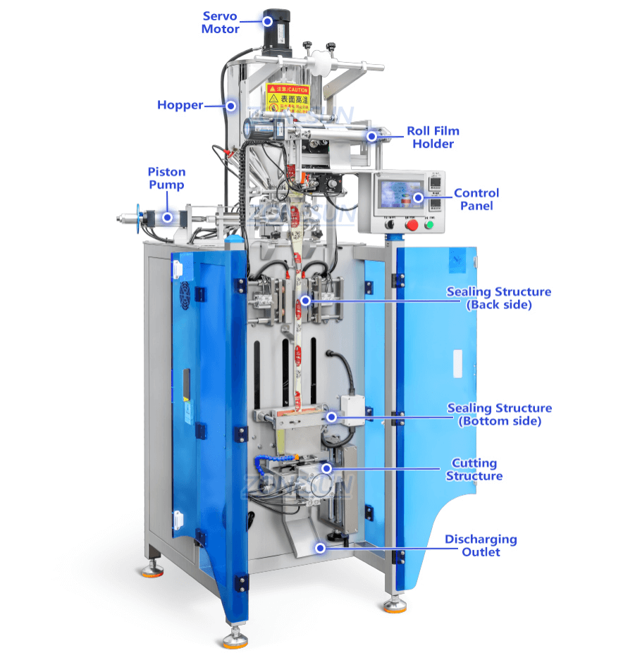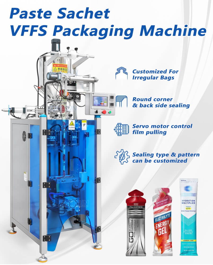 This rounded corner sachet filling sealing machine utilizes a servo motor and driver to accurately pull the packaging film, ensuring high precision and efficiency.