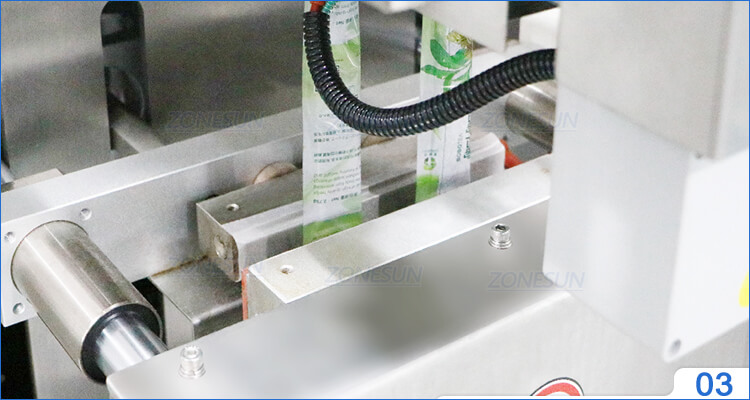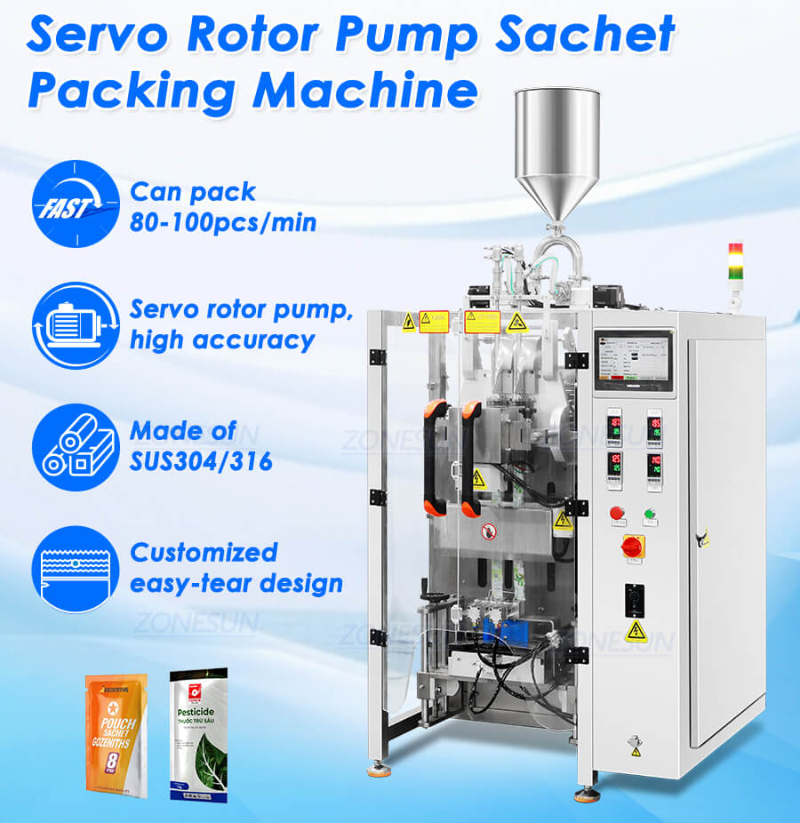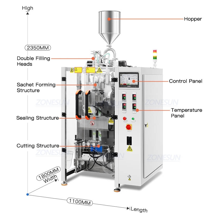 This servo motor VFFS packing machine can efficiently complete the process of supplying material, bag making, filling, sealing, and date coding. With a double lane design, it enhances productivity. The sealing type can be customized based on production requirements. It is ideal for packaging shampoo, sauce, honey, fruit jam, and ketchup.