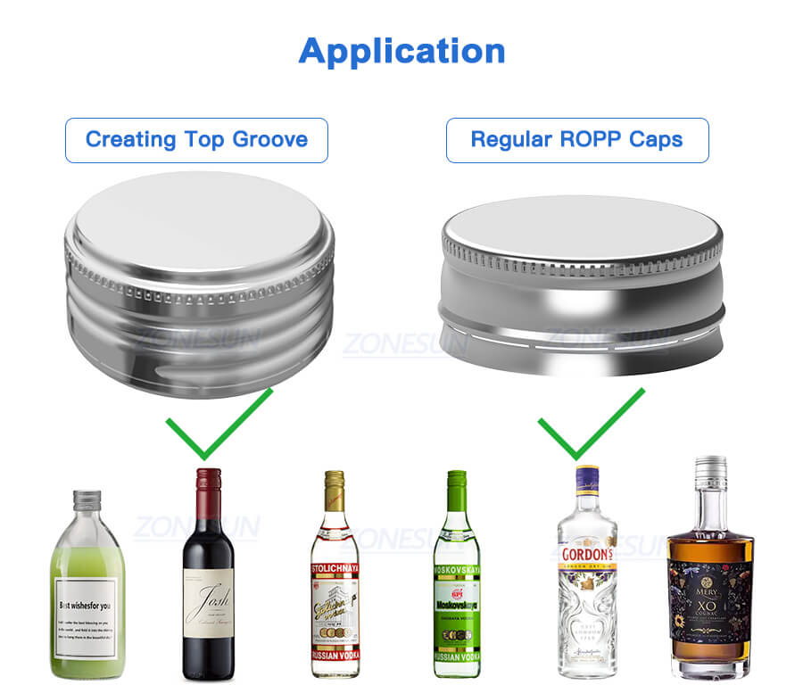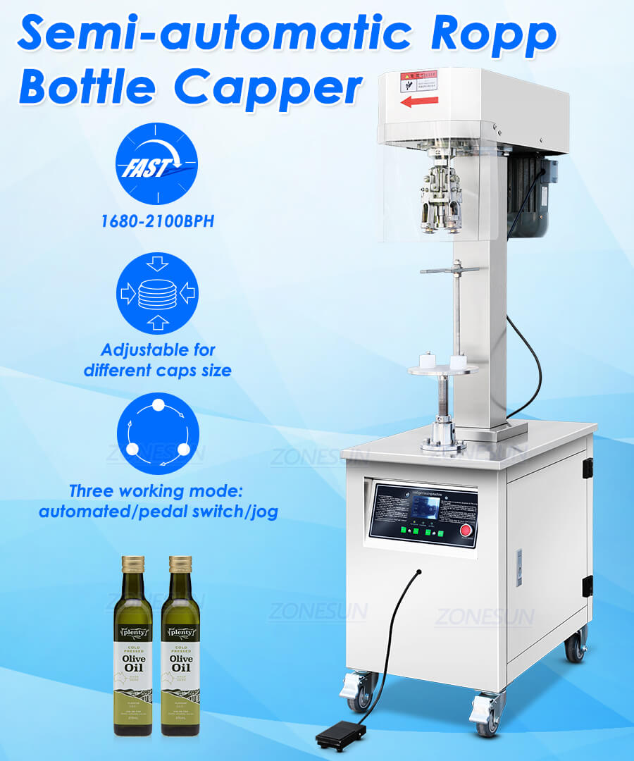 Designed for sealing metal aluminum roll-on pilfer proof (ROPP) caps, the capping structrue is adjustable according to caps diameter.It is suitable for small scale production of liquor, olive oil or beverages.