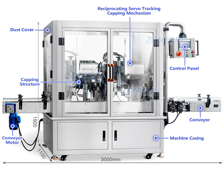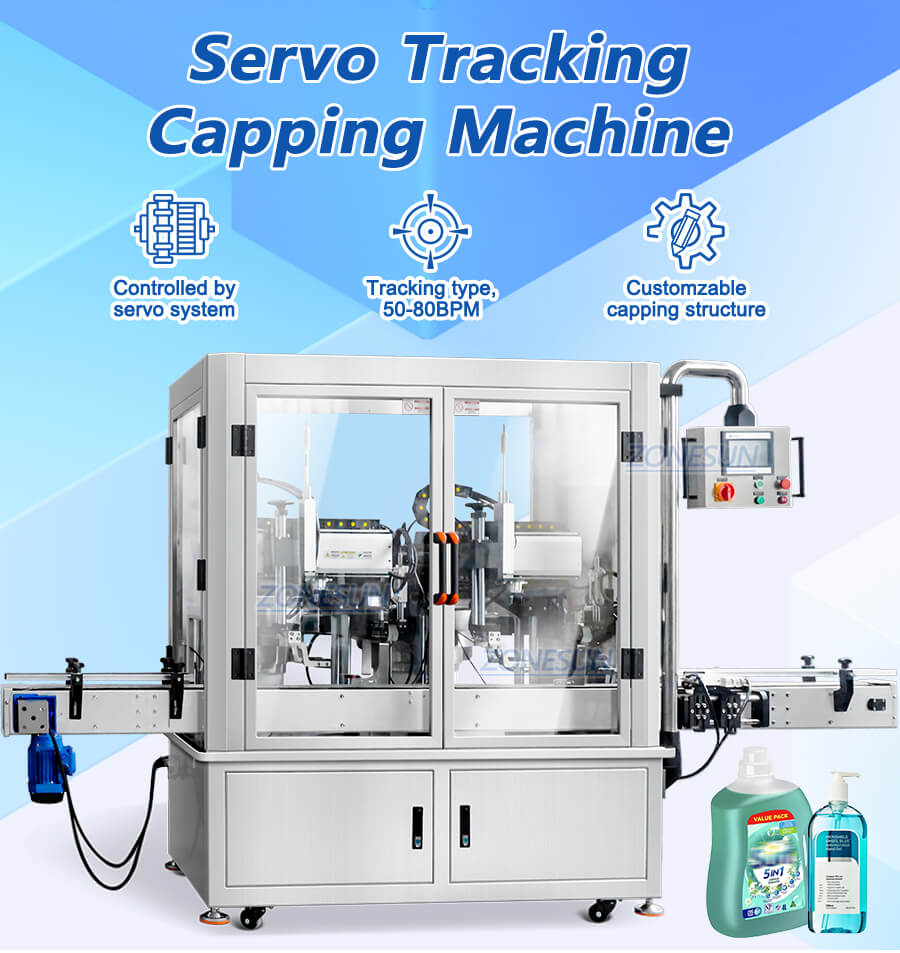 The linear tracking capping machine consists of a servo bottle clamping conveying mechanism, a reciprocating servo following capping mechanism, an electrical control system and a frame. It can complete the capping and quickly reset during the bottle conveying process, and repeat the capping action after grabbing the cap, effectively improving work efficiency.