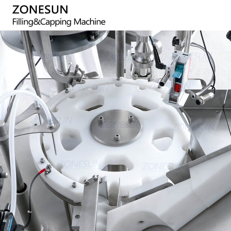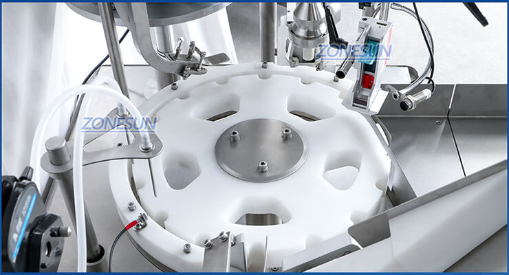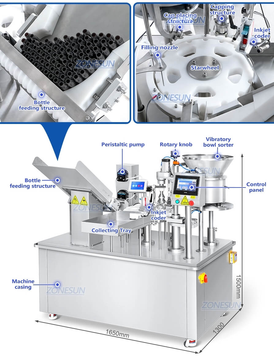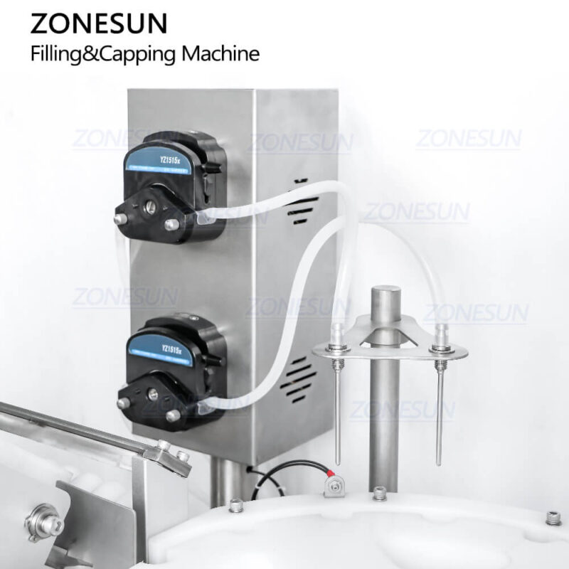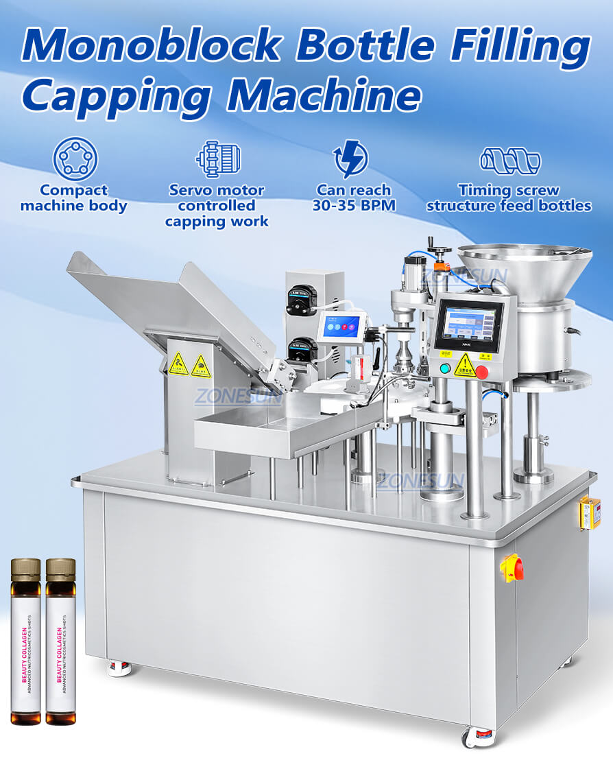 This monoblock machine combines filling and capping into a single starwheel, boasting a compact body to save workspace. Its customized bottle feeding structure is tailored for small bottles that may struggle to stand upright during filling, reducing operational errors. The peristaltic pump ensures that liquid only passes through the hose, allowing each workstation to function simultaneously, enhancing productivity.
