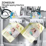 This is a spout pouch packaging machine.It can automatically fill and seal.It is designed with 2 heads for filling.The components,which are in contact with the material,are made of food-grade 316L stainless steel.It adopts a rotary worktable,so it is compact and space-saving.It is commonly used for packaging ready-to-drink beverages,such as juice,jam,and liquid jelly.