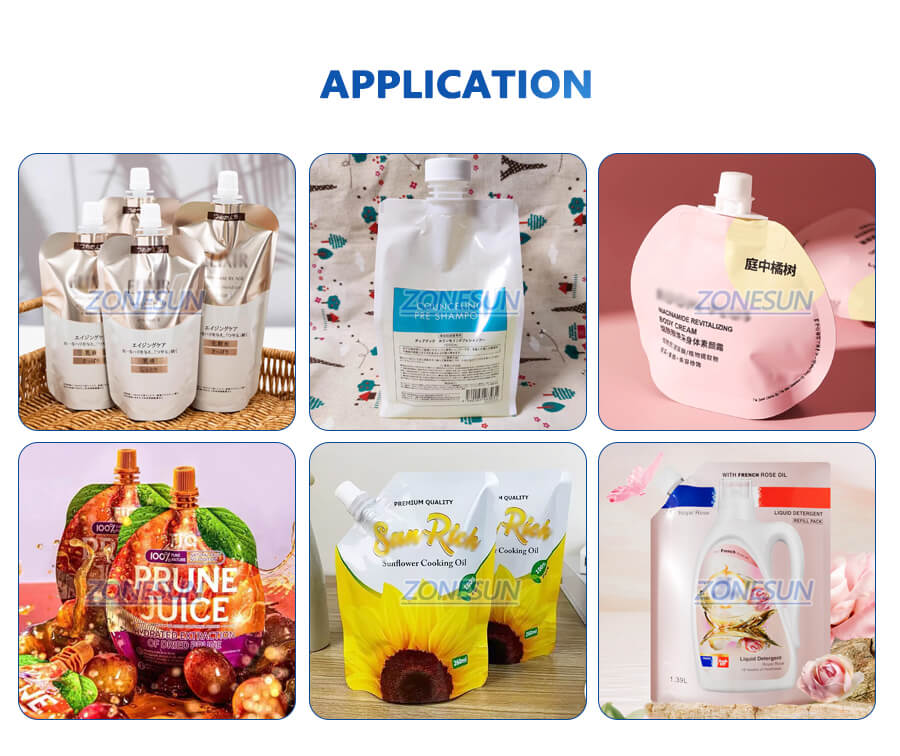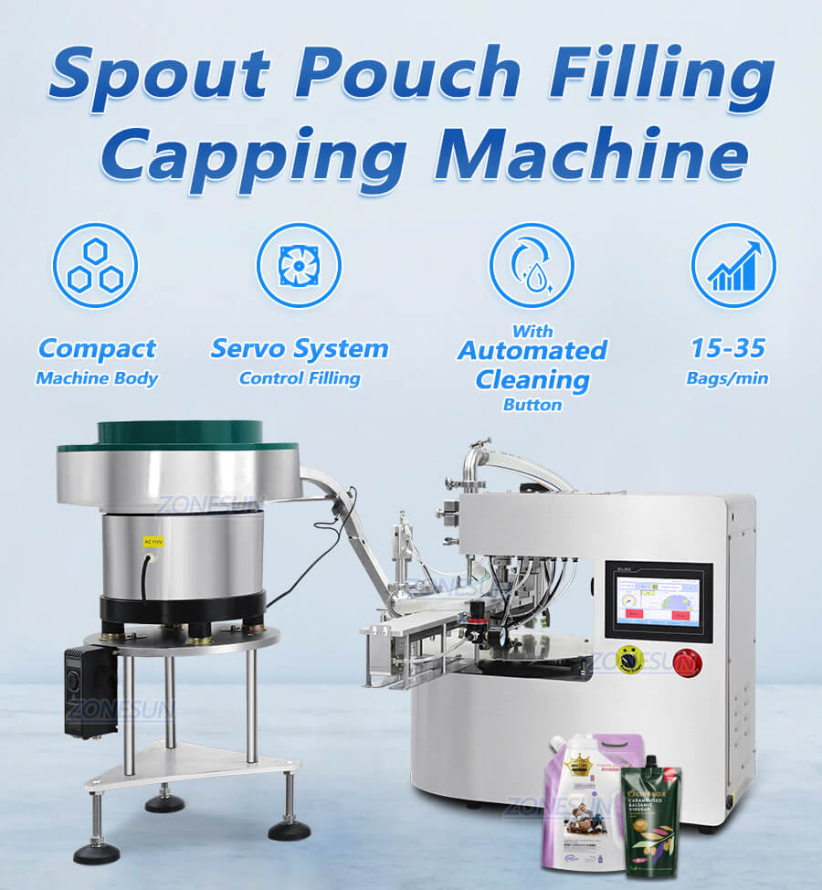 The compact machine body is designed to save working space. This filling and capping machine is specifically crafted for filling liquids into spout pouches, such as drinks, laundry detergent, lotion, cosmetic serum, and tightening caps simultaneously. It’s ideal for small-scale production in the cosmetics and beverage industries.