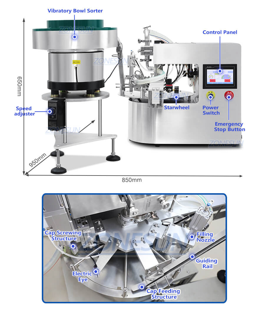 Has function of bag loading, liquid filling, caps feeding and caps tightening, saves working space.